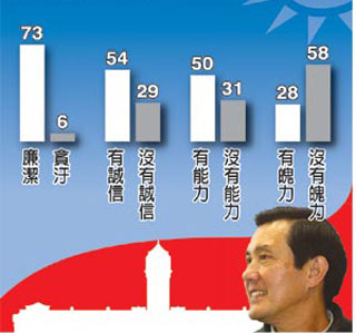 從領(lǐng)導(dǎo)人的誠信特質(zhì)來看,有54%民眾相信馬英九的誠信,僅29%認(rèn)為馬英九缺乏誠信;至于個人能力方面,則有50%民眾肯定馬英九的能力,31%覺得他的能力待加強。