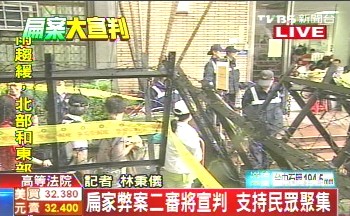 中新網(wǎng)6月11日電 據(jù)臺(tái)灣TVBS報(bào)道,陳水扁家族涉及的公務(wù)機(jī)要費(fèi)、南港展覽館、龍?zhí)顿?gòu)地及洗錢(qián)案等案,臺(tái)灣高等法院于11日上午二審宣判;高等法院場(chǎng)外聚集了一堆挺扁、反扁民眾等候判決結(jié)果,警方派出大批警力,進(jìn)行周邊出入管制,嚴(yán)防沖突發(fā)生。
