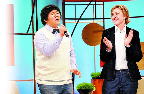 “小胖”先用赴美前苦練的英文抱艾倫大腿:“我真興奮能上你的節(jié)目,因為你在全世界是如此廣為人知。”但當(dāng)艾倫問他:“為何想?yún)⒓印冻壭枪獯蟮馈?”他改以中文回答,艾倫故作聽懂狀,頻頻點頭搞笑,臺下笑聲連連;艾倫再問到他小時曾遭霸凌,請他給遭受相同情況的人一些建言,他回答:“每個人生下來都有用處,要對自己更有自信,最好的報復(fù)就是比他們(霸凌者)更成功!薄靶∨帧钡幕卮饟Q得艾倫鼓勵的擁抱。