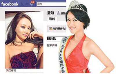 報道說,Amanda在Facebook自稱獲“2006環(huán)球小皇后臺灣區(qū)代表”,據(jù)查,真正代表是李蔚玲,Amanda作假,先在網(wǎng)絡(luò)上放作假戴后冠、肩帶的照片,又放上與李蔚玲披該賽代表肩帶的合照,因作假露餡,之后取下照片。