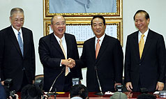 據(jù)“中央社”報(bào)道,宋楚瑜上午在秘書長秦金生等人陪同下前往國民黨中央拜會吳伯雄,兩人晤談后共同召開記者會。吳伯雄表示,國親必須奮發(fā)來救臺灣,為臺灣兩千三百萬人民留一點(diǎn)生計(jì),這是國親共同的愿望。