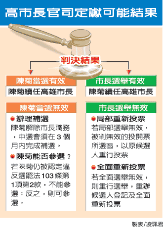 據(jù)臺(tái)灣媒體報(bào)道,一旦法院二審判定選舉無(wú)效或當(dāng)選無(wú)效,依“選罷法”必須在三個(gè)月內(nèi)完成重新選舉。如果二審判定是“選舉無(wú)效”,根據(jù)“選罷法”第一○二條,其違法屬選舉之局部者,就該局部無(wú)效部分定期“重行投票”,否則就是全面“重新選舉”;如果法院的二審判定是“當(dāng)選無(wú)效”,則要進(jìn)行“補(bǔ)選”。若是選舉無(wú)效,陳菊可以再次參選,如果是當(dāng)選無(wú)效,陳菊就不能再補(bǔ)選了。