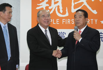 中新網(wǎng)11月19日電 親民黨主席宋楚瑜與國民黨主席吳伯雄今天(19日)共同召開記者會(huì),宣布親民黨“立委”馮定國退出區(qū)域“立委”選舉。但黨籍“立委”沈智慧等仍不愿退選,宋楚瑜表示,明天為“中選會(huì)”受理“立委”參選人登記最后一天,國親一定努力整合到最后一刻,不放棄任何機(jī)會(huì)。