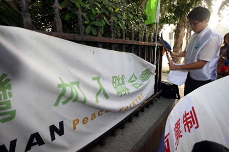 他們除在“行政院”圍墻掛上“一票投人、一票投黨”布條,也打算將標(biāo)語貼在門口的“入聯(lián)”牌樓上,但遭警方制止,最后改貼在門口柱子上。