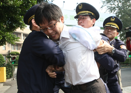 中新網(wǎng)12月11日電 臺灣第三社會黨發(fā)言人林致真、楊偉中今天上午前往臺當(dāng)局“行政院”門口,剪斷掛在圍墻的“牽手護(hù)臺灣,加入聯(lián)合國”布條,與警方發(fā)生沖突。