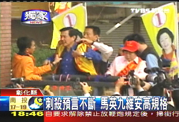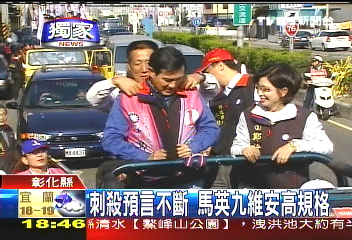 這一陣子馬英九所到之處,總是防彈公文包、防彈盾牌貼身護衛(wèi)。尤其是在上個星期六,馬陣營接獲通知有人要在嘉義刺殺馬英九,安全人員立刻進入紅色警戒。