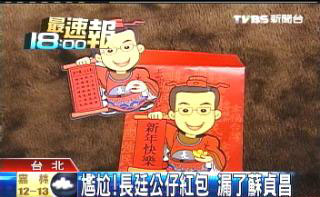 民進(jìn)黨的長(zhǎng)昌配設(shè)計(jì)公仔紅包,不過(guò)支持者發(fā)現(xiàn)紅包袋上只有謝長(zhǎng)廷公仔,漏了蘇貞昌。 TVBS圖