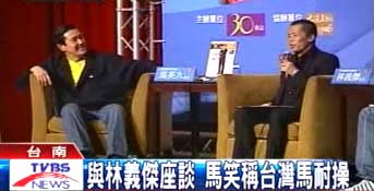 這邊造勢(shì)炮火很猛,另一頭則是溫馨的感性座談,馬英九和極限長(zhǎng)跑好手林義杰面對(duì)面大講冷笑話。極限長(zhǎng)跑好手林義杰:“在沙漠的時(shí)候,蒙古人騎的馬,他們的馬已經(jīng)跑不動(dòng)了,就是因?yàn)槁吠咎L(zhǎng),動(dòng)物可能沒(méi)辦法接受!瘪R英九:“臺(tái)灣的馬不會(huì)這樣!