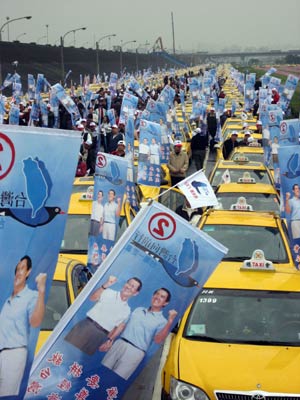 中新網(wǎng)3月10日電 向來被視為挺綠勢力的臺灣“全民出租車聯(lián)誼會”決定棄綠轉(zhuǎn)藍(lán),在總會長邱奕枝號召下,上午陸續(xù)聚集兩千五百輛出租車并成立馬蕭后援會,場面壯觀。