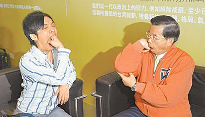 兩人互道再見(jiàn)時(shí),大炳故意問(wèn)了一句:“要拍背嗎?”兩人還作勢(shì)繞圈閃了一下,謝長(zhǎng)廷接話(huà)說(shuō),“這是連戰(zhàn)和阿扁四年前發(fā)明的招式,兩人因此繞了一分鐘耶。”