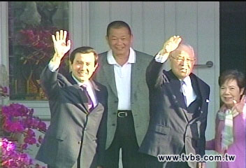 馬英九和蕭萬長到來后,李登輝走下階梯“恭迎”上樓,回過頭還不忘提醒馬英九對面有媒體在守候。馬英九舉起手來,兩人一起向媒體揮手致意,隨即進(jìn)入室內(nèi)密談。