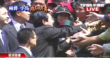 報道說,在民眾熱烈的歡呼聲中,馬英九、蕭萬長抵達蔣介石慈湖陵寢。馬英九以微笑回應(yīng)民眾,并與民眾握手、打招呼。