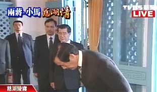 在蔣介石靈前,馬英九眉頭深鎖,行三鞠躬禮,一旁陪同的有準副手蕭萬長、桃園縣長朱立倫。馬英九表示,蔣介石、蔣經(jīng)國的功過都可以討論,而不該一味崇拜或打壓。