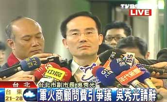 中新網(wǎng)4月24日電 據(jù)臺灣TVBS報道,被雜志報道疑似收受軍火商顧問費引發(fā)爭論的臺北市副市長吳秀光,23日大動作控告媒體以及民進(jìn)黨民意代表后,原本說不再發(fā)言的他,下午4點再度召開記者會。