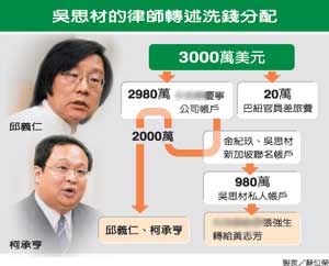 據(jù)臺灣《聯(lián)合報》報道,徐景星說,根據(jù)吳思材留下的洗錢分配流程數(shù)據(jù)及吳思材先前告訴他,臺涉外部門透過辦理“機密外交”常使用的一家人頭公司(慶寧公司)賬戶,先將兩千九百八十萬美元匯到金紀玖和吳思材在新加坡銀行開立的聯(lián)名賬戶內(nèi);其中九百八十萬美元,金紀玖對吳思材說:“老板(邱義仁)指示要把九百八十萬匯到你個人賬戶內(nèi)!庇谑菂呛徒鸺o玖辦理轉(zhuǎn)匯,當(dāng)時張瓊森也在場。