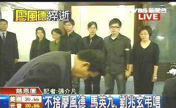 據(jù)臺灣TVBS報道,廖風(fēng)德因病猝逝可謂“驟失英才”,讓人措手不及,他的家人在慈恩園為他布置靈堂,在今天上午10點開始讓親友吊唁,面色凝重的馬英九、準“行政院長”劉兆玄、“立委”蔣孝嚴也來到靈堂送他最后一程。