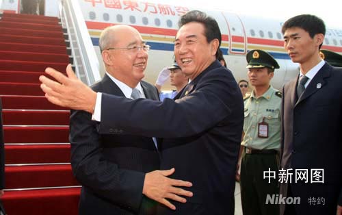 中新網(wǎng)5月26日電 中國國民黨主席吳伯雄率訪問團(tuán)于今天下午16時36分飛抵南京,中共中央臺辦主任陳云林到機(jī)場迎接。