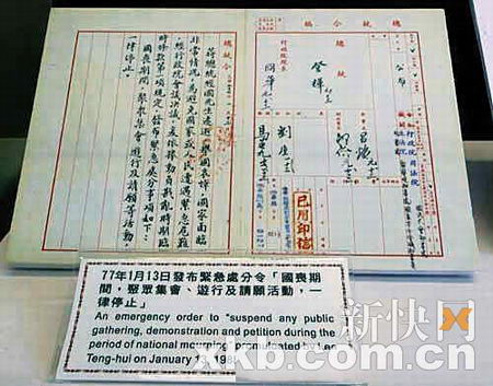 臺(tái)“總統(tǒng)府”9日上午開(kāi)放民眾參觀,展覽室內(nèi)展出歷任“總統(tǒng)”文物及公文稿,據(jù)臺(tái)灣媒體9日?qǐng)?bào)道,其中包括1988年蔣經(jīng)國(guó)逝世時(shí),馬英九受命用毛筆撰寫(xiě)的緊急處分令真跡,規(guī)范在“國(guó)喪”期間,全臺(tái)禁止聚眾集會(huì)、游行、請(qǐng)?jiān)傅然顒?dòng),當(dāng)時(shí)馬英九是“總統(tǒng)府”第一局副局長(zhǎng),簽出來(lái)的文稿還要層層上報(bào),由長(zhǎng)官批示,最后由繼任“總統(tǒng)”的李登輝批定。