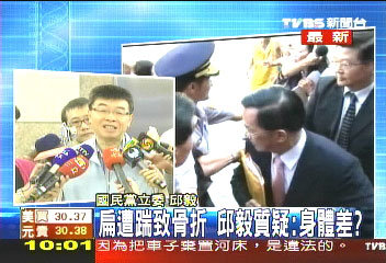 中新網(wǎng)7月22日電 昨天陳水扁出庭遭踹疑導(dǎo)致骨折,今天國民黨“立委”邱毅出面質(zhì)疑,是否有造假的可能。邱毅表示,如果被踢一腳就受傷,身體也太差了。