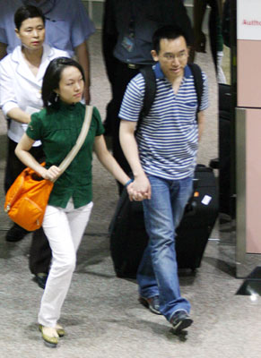 陳致中夫婦25日清晨5時左右搭機返臺,兩人手牽手步出海關(guān)!爸醒肷纭眻D