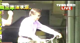 黃志芳帶著墨鏡,騎著腳踏車(chē)來(lái)到特偵組接受約談 臺(tái)灣TVBS圖