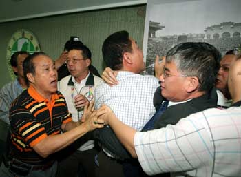 昨晚在臺北市舉辦挺扁大會的臺北市黨部主委黃慶林今天率眾到黨中央抗議,要求王拓下臺。中央黨部副秘書長洪耀福接見時開口提及“當(dāng)初第一個主張開除陳水扁的就是黃慶林”時,黃慶林立刻拍桌表示不滿,立即引發(fā)拉扯沖突,場面混亂,黃慶林人馬與中央黨部人員發(fā)生扭打,最后洪耀福在黨工的保護(hù)下先行離開。