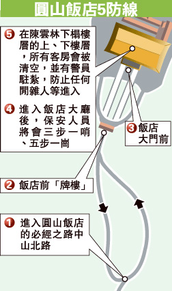 此外,臺警方31日也陸續(xù)在圓山飯店前的牌樓、忠烈祠、北安公園路口等放置拒馬,晚上6時許,保一總隊(duì)駐扎飯店門口,制服與便衣警員則定時入內(nèi)視察。警方表示,屆時將派40名霹靂小組干員,全天候貼身保護(hù)陳云林,每天至少有800名警員執(zhí)勤;若抗議者施放沖天炮,恐引發(fā)火警,一旦逮捕違規(guī)者,警方一律移送法辦,確保陳云林在臺期間的人身安全。