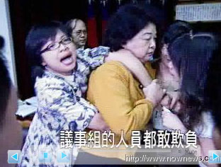 “項(xiàng)目報(bào)告啦,項(xiàng)目報(bào)告嘛”,“先讓她念完再報(bào)告嘛!”藍(lán)綠雙方拉扯成一團(tuán)。會(huì)議主席在上面大喊,連議事組的人員都敢欺負(fù)。