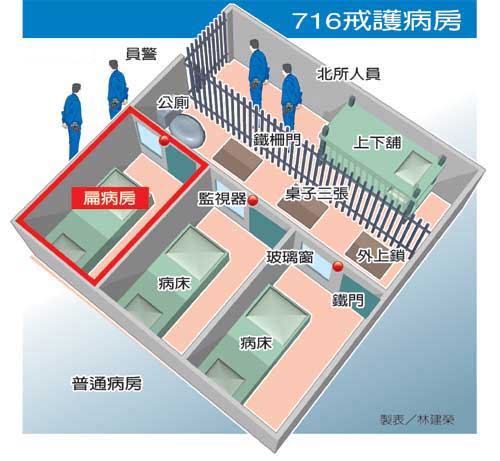 臺北縣立醫(yī)院板橋院區(qū)戒護(hù)病房位在七樓第十六間病房,編號“716”,屬于臺北看守所專用,即使無受刑人或在押被告就醫(yī),仍由看守所管理,醫(yī)護(hù)人員私下戲稱716房是“監(jiān)獄病房”。