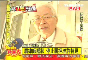 陳水扁委任律師鄭勝助來(lái)到臺(tái)灣特偵組遞申請(qǐng)狀,希望特偵組能依循嘉義縣長(zhǎng)陳明文模式,讓陳水扁能夠特見(jiàn)他的家人。圖片來(lái)源:臺(tái)灣TVBS