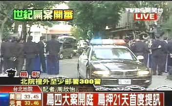 車隊(duì)不到15分鐘即抵達(dá)臺北地院,鐵門隨即降下,不讓陳水扁的模樣曝光,據(jù)指出,陳水扁今天沒有抹發(fā)油,頂著一頭翹發(fā)、戴著手銬出庭。他的兩位委任律師鄭文龍和石宜琳,之前預(yù)告要在庭上做出激烈手段,因此警方不敢大意,部署霹靂小組在法庭內(nèi)戒備。