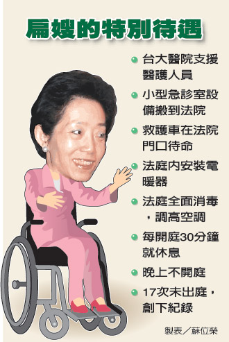2006年12月15日機(jī)要費(fèi)案首次開庭,吳淑珍即因身體不適昏倒送醫(yī),迄今已有17次請(qǐng)假不出庭紀(jì)錄,消失787天的她在10日出庭會(huì)有什么表現(xiàn)?身體情況如何?都成為外界矚目焦點(diǎn),扁委任律師石宜琳9日傍晚轉(zhuǎn)述陳水扁的話指出,她以前在家中,“就常出現(xiàn)前一分鐘還有說有笑,后一則鐘就突然昏倒”。