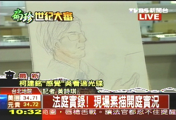 而在法庭內(nèi)的素描,坐在被告席上的陳水扁看來(lái)有些駝背,面前擺著一臺(tái)計(jì)算機(jī),所有對(duì)話都會(huì)在計(jì)算機(jī)中顯現(xiàn)出來(lái),在被告席左邊的是律師席,坐著陳水扁律師鄭文龍,而被告席正對(duì)面就是審判者蔡守訓(xùn),蔡守訓(xùn)一開始問(wèn)陳水扁是不是心跳加速、會(huì)氣喘?陳水扁連話都沒(méi)有說(shuō),只是點(diǎn)點(diǎn)頭,低頭看著計(jì)算機(jī)屏幕。