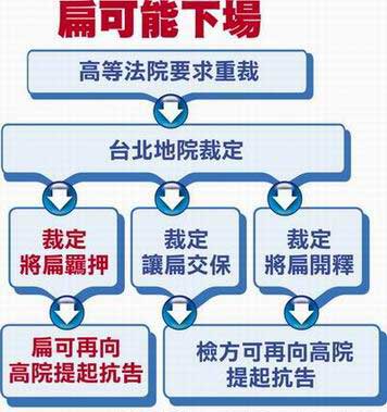 但到昨天,臺灣高等法院又以看不出有什么證據(jù)判斷扁的犯罪嫌疑重大,不能依以往權(quán)貴犯罪棄保潛逃例子押扁等理由,認為臺北法院不該把這些事項當作羈押條件。顯示在押扁與否的程序大戰(zhàn)中,臺灣高等法院在幾次裁定中,有時支持檢方的論點,有時又認同律師的觀點,也導(dǎo)致扁是否要被收押,至今仍無定論。