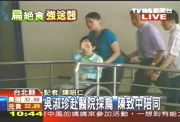 中新網(wǎng)5月11日電 據(jù)臺(tái)灣TVBS報(bào)道,陳水扁因?yàn)榻^食身體虛弱遭到強(qiáng)制送醫(yī),目前仍在臺(tái)北縣立板橋醫(yī)院接受治療。陳水扁夫人吳淑珍偕同兒子陳致中11日上午來(lái)醫(yī)院特見(jiàn)陳水扁。