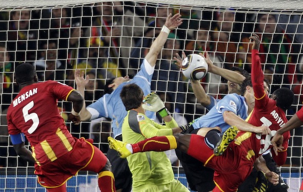 加納隊(duì)與烏拉圭隊(duì)的世界杯1/4決賽,可謂是一波三折。在加時(shí)賽的最后關(guān)頭,加納隊(duì)險(xiǎn)些攻破烏拉圭隊(duì)的大門,不過(guò)烏拉圭隊(duì)的前鋒蘇亞雷斯卻上演上帝之手,將皮球拍了出去。他的這個(gè)違反體育精神的舉動(dòng),卻給烏拉圭隊(duì)帶來(lái)了一線生機(jī),在加納隊(duì)前鋒吉安罰丟點(diǎn)球后,烏拉圭隊(duì)在點(diǎn)球大戰(zhàn)中4比2淘汰加納。