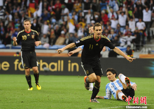 中新網(wǎng)7月3日電 今晚22:00,南非世界杯1/4決賽第三場展開了角逐,阿根廷隊在開普敦綠點球場迎來了德國隊的挑戰(zhàn)。穆勒在上半場第3分鐘先拔頭籌,下半場克洛澤梅開二度,弗雷德里希也打入一球,德國隊4-0狂勝阿根廷,昂首晉級半決賽。
