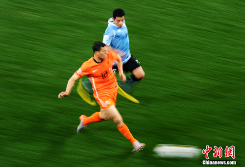 中新網(wǎng)7月7日電 今天凌晨2:30,南非世界杯半決賽首場較量在開普敦綠點(diǎn)球場拉開戰(zhàn)幕,由南美老牌勁旅烏拉圭迎戰(zhàn)荷蘭隊(duì)。布隆克霍斯特遠(yuǎn)射先拔頭籌,而弗蘭也通過一記遠(yuǎn)射將比分扳平。下半場斯內(nèi)德和羅本連續(xù)進(jìn)球一度令荷蘭隊(duì)鎖定勝局,然而補(bǔ)時(shí)階段烏拉圭人的進(jìn)球似乎又燃起了最后的希望,但荷蘭隊(duì)頂住了對(duì)手的瘋狂進(jìn)攻,3-2擊敗烏拉圭隊(duì),成功挺進(jìn)決賽。