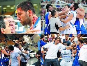 昨天的比賽臨近結(jié)束時(shí),希臘隊(duì)當(dāng)時(shí)以74比73領(lǐng)先塞爾維亞,隨后雙方兩名無(wú)球隊(duì)員產(chǎn)生口角,并發(fā)展成肢體沖突。而后發(fā)生了最殘酷的一幕,塞爾維亞隊(duì)隊(duì)長(zhǎng)、效力于NBA雷霆隊(duì)的科斯蒂奇卷入沖突,他抓起一把椅子丟向比賽中與其對(duì)位的希臘隊(duì)中鋒肖特薩尼蒂斯,不料椅子卻擊中因傷坐在希臘隊(duì)替補(bǔ)席上的布魯西斯,后者頭部頓時(shí)鮮血直流。此后有多名球員卷入此次群毆事件,現(xiàn)場(chǎng)亂作一團(tuán)。據(jù)美聯(lián)社報(bào)道,雙方后在球員通道內(nèi)再次發(fā)生斗毆。而就在這起惡性打架事件發(fā)生前6分鐘左右,塞爾維亞隊(duì)主帥伊夫科維奇因與主裁判發(fā)生沖突而被吹了兩次技術(shù)犯規(guī),最終被逐出場(chǎng)。
