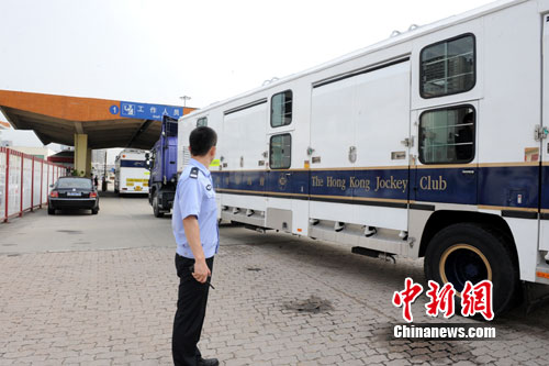 10日清早7時(shí)40分,香港賽馬會(huì)的兩輛粵港兩地牌貨車(車內(nèi)運(yùn)有18匹賽馬)和6輛隨行保障車由香港經(jīng)皇崗口岸入境,皇崗邊檢站警戒隊(duì)按預(yù)案要求,派警車從橋頭將運(yùn)馬車輛一行安全引帶至貨檢入境查驗(yàn)場地?吭谥付ǖ呐R時(shí)候檢區(qū)域,并擔(dān)負(fù)警戒監(jiān)護(hù)工作。在檢驗(yàn)檢疫部門進(jìn)行消毒的同時(shí),貨車檢查隊(duì)、小(客)車檢查隊(duì)的民警立即聯(lián)動(dòng),高效、快捷、優(yōu)質(zhì)的為入境機(jī)動(dòng)車司機(jī)、馬童及隨行人員共33人的證件辦理查驗(yàn)手續(xù)。8時(shí)50分,運(yùn)馬車輛及隨行人員離開皇崗口岸前往廣州亞運(yùn)馬術(shù)場。