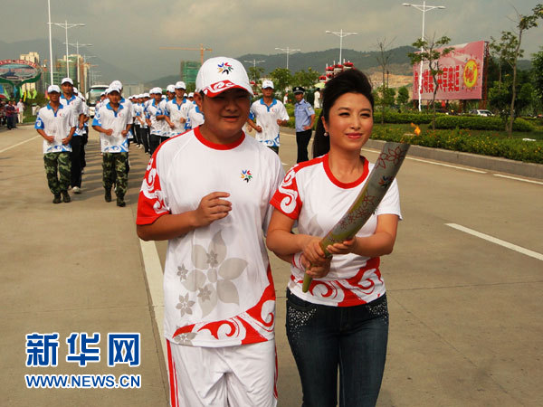 9月12日上午,以“關(guān)注特奧,情燃海西;和諧之光,普照八閩”為主題的第五屆全國特奧會火炬?zhèn)鬟f活動最后一站在福建寧德隆重舉行。日前剛剛被聘任為本屆特奧會愛心大使的著名歌唱家劉媛媛?lián)?1名火炬手之一,攜智障兒童雷孝文共同進(jìn)行了第二棒的傳遞。盡管每一棒接力只有60米的距離,但劉媛媛仍然難掩興奮之情:“真的非常高興,‘愛心大使’和‘火炬手’的雙重身份令我倍感榮幸和責(zé)任。通過火炬?zhèn)鬟f這個儀式,希望更多的人能夠參與到關(guān)注、關(guān)心、關(guān)愛智障孩子的事業(yè)當(dāng)中來!笔栈饍x式后,劉媛媛與幾名青年志愿者共同放飛了象征著希望與美好的和平鴿。儀式現(xiàn)場,劉媛媛還攜數(shù)名智障運動員演唱了《感恩》、《美好祝!穬墒赘枨。