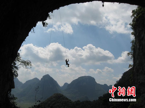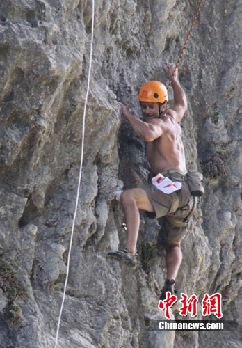 中新網(wǎng)河池9月18日電(陸旺)9月18日,廣西羅城國際攀巖賽在中國唯一的仫佬自治縣——廣西河池市羅城仫佬族自治縣的月亮山開賽。被視為2010羅城攀巖旅游節(jié)的重頭戲,中外80名攀巖愛好者以及部分觀眾上午8點鐘便聚集在形狀宛若一輪明月的月亮山下,相互“攀比”、切磋攀巖技術(shù)。