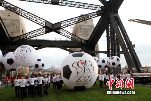 為表達(dá)悉尼對(duì)澳大利亞申辦2022年FIFA世界杯的支持,一個(gè)印著“Come Play”字樣,高達(dá)四米的巨型足球沿著澳洲標(biāo)志悉尼大橋的中心滾動(dòng),帶動(dòng)起“來(lái)踢球”的熱忱與激情。