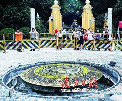 據(jù)介紹,原點標(biāo)志表面微凸,高出地面15厘米,直徑3米。標(biāo)志物外圍采用灰、黑兩色花崗巖作襯邊,沿放射線方向鑲嵌銅條,花崗巖表面陰刻了廣州建城歷史簡記。內(nèi)側(cè)圓盤采用2厘米厚的黃銅板和巴西水晶石制成,重達(dá)3噸,圖案取材于南越王墓出土的“龍鳳玉佩”和“羽人駕舟”浮雕圖案,彰顯了嶺南文化特色。