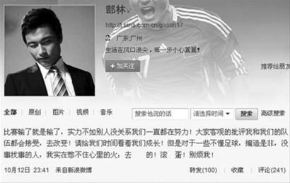 本報訊 面對南非世界杯殿軍烏拉圭,0:4的比分讓中國隊很不爽。賽后,很多人對國足的表現(xiàn)很不滿意。讓人意外的是,“高家軍”主力前鋒郜林賽后居然在個人微博中破口大罵,對外界的質(zhì)疑“強力反擊”!氨荣愝斄司褪禽斄,實力不如別人沒關(guān)系我們一直都在努力!大家客觀的批評我和我們的隊伍都會接受,去改變!請給我們時間看著我們成長!但是對于一些不懂足球,編造是非,沒事找事的人,我實在憋不住心里的火:去你媽的!滾XX蛋!別煩我! ”看的出來,輸球后的郜林有失大將之風(fēng),徹底爆發(fā)了……