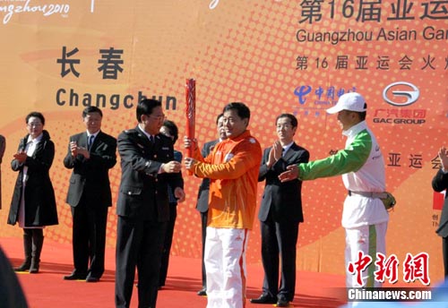 中新網(wǎng)長春10月15日電 (李彥國 田偉)第16屆廣州亞運會火炬15日在吉林省長春市進行展示性傳遞,這是本屆亞運會火炬?zhèn)鬟f在廣東省外的第二站。16名火炬手在長春世界雕塑公園完成16棒傳遞,5000余名長春市民現(xiàn)場見證這一時刻。(完)