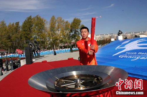 中新社長(zhǎng)春10月15日電 (李彥國(guó) 田偉)第16屆廣州亞運(yùn)會(huì)火炬15日在吉林省長(zhǎng)春市進(jìn)行展示性傳遞,這是本屆亞運(yùn)會(huì)火炬?zhèn)鬟f在廣東省外的第二站。16名火炬手在長(zhǎng)春世界雕塑公園完成16棒傳遞,5000余名長(zhǎng)春市民現(xiàn)場(chǎng)見(jiàn)證這一時(shí)刻。