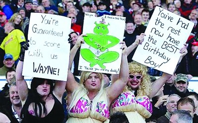 憑借墨西哥國(guó)腳前鋒赫爾南德斯的梅開二度,曼聯(lián)在客場(chǎng)2:1小勝斯托克城。但在比賽中,主隊(duì)球迷沒有放過與曼聯(lián)續(xù)約后去迪拜度假而缺陣的魯尼。三位斯托克城的球迷男扮女裝,戴上假發(fā),變身穿著性感裙裝、佩帶假胸的妖冶女郎,舉著標(biāo)語牌,對(duì)魯尼這個(gè)他們眼中的丑角進(jìn)行大肆嘲諷與惡搞,顯然是暗地里指魯尼喜歡這些裝束夸張的妓女。(許凱)