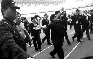 終場前5分鐘,主席臺上的馬拉多納終于起身,現(xiàn)場主持人興奮得馬上宣布,“馬拉多納因為有腿傷,特地半小時前打了封閉,現(xiàn)在可以下場踢球了!币粫r間,全場又是一陣歡呼聲。不過,此時全場最搞笑的一幕出現(xiàn)了,腳穿皮鞋的馬拉多納在贊助商陪同下走到場邊,然后,對著場內大呼小叫了一番,前后不過三四分鐘時間,主裁就吹響全場結束哨聲?磁_上,至少花200元錢買票入場的球迷這才發(fā)覺上當,終于爆發(fā)出陣陣吼聲:“騙子,退票!退票!”此時,老馬頭也不抬,一溜煙跑回了休息室。記者 徐東海
