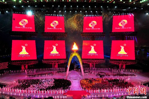 隨著中國(guó)總理溫家寶正式宣布亞運(yùn)會(huì)開幕,整個(gè)會(huì)場(chǎng)和天空再次被無數(shù)絢爛的煙火照亮。